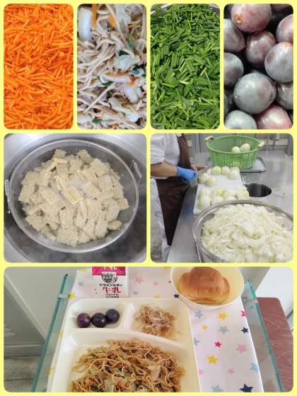 児童に人気の『オイスター焼きそば』は、ソースが麺と具材によくからんで食欲をそそる一品です。『もやしの中華あえ』は、シャキシャキとした食感のもやしに甘酸っぱいタレをかけあえています。今日のデザートは、『ぶどう(巨峰)』がでました。房が大きく、甘くて美味しかったです。