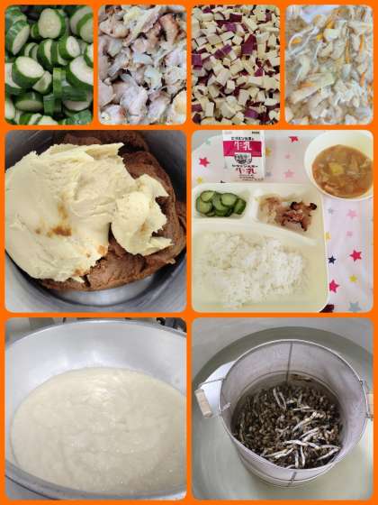 『鶏肉の塩こうじ焼き』は、鶏肉にお肉をやわらかくしてくれる塩こうじで下味をつけ、玉ねぎを混ぜ合わせ焼いています。『さつまいものみそ汁』は、給食室で丁寧に、にぼしでだしをとり、秋が旬のさつまいもなどを使用したみそ汁です。甘くてホクホクしたさつまいもとにぼしの風味がよく合い美味しかったです。