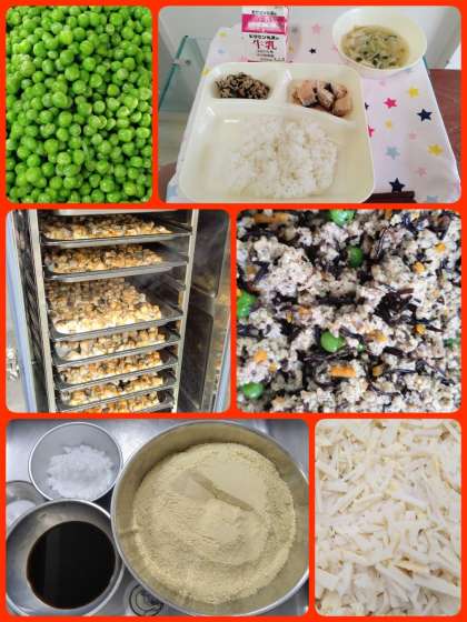 『五目汁』は、キャベツ、たけのこ、えのき、青ねぎなどを使用した具だくさんの汁ものです。『高野どうふのいり煮』は、豚ひき肉の旨みをたっぷり吸いこんだおだしに高野どうふを含ませ仕上げています。にんじん、ひじき、グリンピースを使用した彩りのよい煮ものです。
