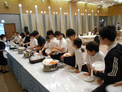 朝食会場では順に料理をお皿に取り、班ごとに朝食をいただきました。