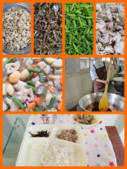 『ふきよせ煮』は、鶏肉、旬のさといもやれんこん、しめじ。にんじん、さんど豆などを使用した彩り豊かな煮ものです。おだしの旨みが食材にしっかりしみ込んでいました。『くきわかめのつくだ煮』は、食感の良いくきわかめをだし、しょう油などでじっくり煮込んでいます。ごはんがすすむ献立です。