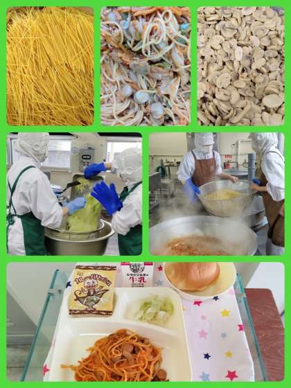 『イタリアンスパゲッティ』は、豚肉、ウインナーを主材に、にんじん、ピーマン、マッシュルーム、玉ねぎをを使用したケチャップ味のスパゲッティです。『カレーフィッシュ』は、国産のかたくちいわしを使用しています。骨や歯をじょうぶにするカルシウムが多く含まれています。