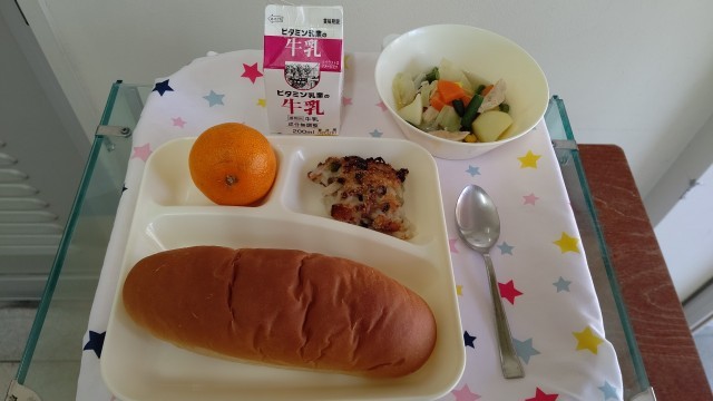 『きのこのドリア』は、乳・小麦を使用せずに、シチューのルウで味つけをしています。旬のきのこをたっぷり使ったドリアです。『鶏肉と野菜のスープ煮』は、鶏肉を主材に、じゃがいも、キャベツ、にんじん、さんどまめ、コーンを使用した具だくさんのスープ煮です。デザートに『みかん』がでました。甘くて美味しかったです。