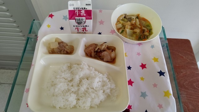 鶏肉の甘辛焼き みそ汁 だいこんの煮もの ごはん 牛乳