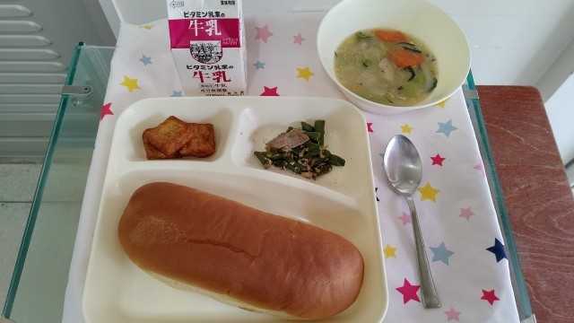 はくさいのとろみ煮 あつあげのピリ辛じょうゆかけ 豚肉とさんどまめのオイスターソース炒め 黒糖パン 牛乳