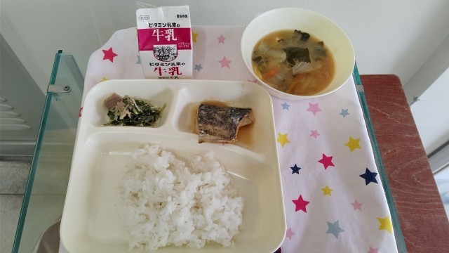 さごしのみぞれかけ みそ汁 みずなの煮びたし ごはん 牛乳