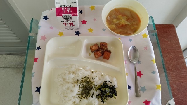 今日の献立は、令和6年度学校給食献立コンクール優秀賞に選ばれた献立です。児童の考えた献立のねらいは、「ごはんがおいしく食べられて、いろどりのよい献立を考えました。」です。『じゃがいもとベーコンのみそ汁』は、にぼしでだしをとり、ベーコン、じゃがいも、たまねぎ、はくさい、にんじんを使用しています。ベーコンとにぼしの旨みたっぷりのみそ汁です。ごはんがすすむ献立です。