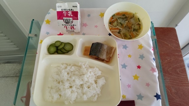 『さばのみそ煮』は、しょうが、赤みそなどで煮含めることで臭みを消し、児童にも食べやすい味つけになっています。『五目汁』は、はくさい、にんじん、えのきたけ、青ねぎを使用した具だくさんの汁ものです。おだしの風味をしっかり感じる献立で、美味しかったです。