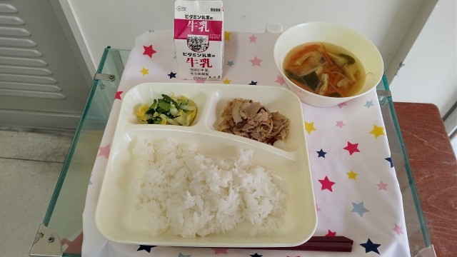 豚肉のスタミナ焼き 五目汁 きくなとはくさいのおひたし ごはん 牛乳