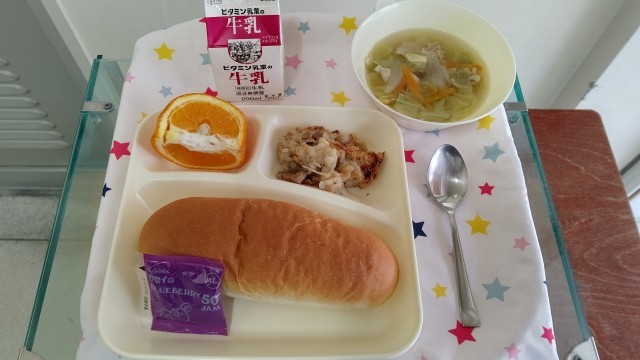 押麦のグラタン スープ いよかん コッペパン ブルーベリー 牛乳