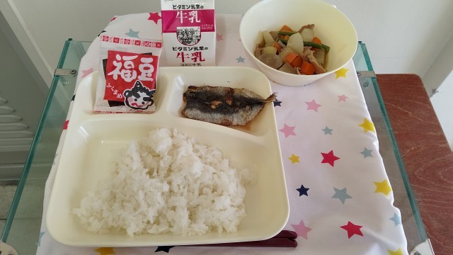 今日は、節分の行事献立です。『いわしのしょうがじょうゆかけ』は、焼いた開きのいわしにしょうがの風味をきかせたタレをかけています。節分の日にいわしを食べるのはいわしのにおいや、頭で悪いものを追い払う意味があります。含め煮といっしょに美味しく頂きました。