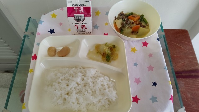 『肉じゃが』は、牛肉、じゃがいも、糸こんにゃく、玉ねぎ、にんじん、さんどまめを使用した児童に好評な献立です。『白花豆の煮もの』は、白花豆を焼き物機でふっくらと煮て、味を含ませています。甘すぎず食べすくて美味しかったです。
