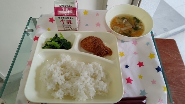 たらフライ うすくず汁 こまつなのごまあえ ごはん 牛乳