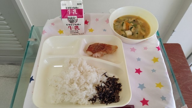 あかうおのレモンじょうゆかけ みそ汁 牛ひじきそぼろ ごはん 牛乳