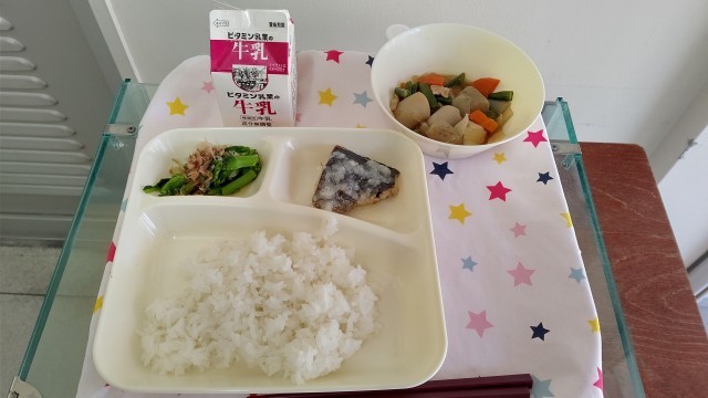 さごしの塩こうじだれかけ さといもと野菜の含め煮 なのはなのおひたし かつおぶし ごはん 牛乳