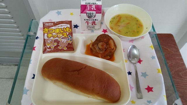 煮こみハンバーグ コーンスープ おさつチップス 黒糖パン 牛乳