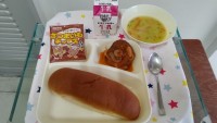 今日は、入学祝い献立がでました。1年生のみなさんが小学校になったお祝いの献立です。じっくり煮込んだカツカレーライスの中にハートや星など色々な形のにんじんが隠れている「ラッキーにんじん」の日でした。カツもサクサクで美味しかったです。