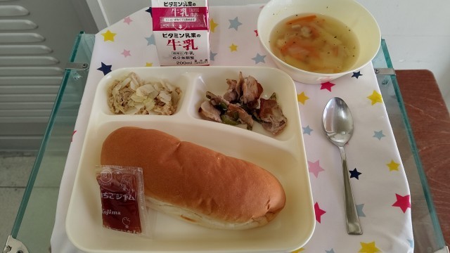 豚肉のガーリック焼き スープ ツナとキャベツのソテー コッペパン いちごジャム 牛乳