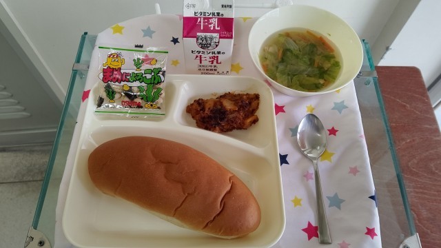 『じゃがいものミートグラタン』は、牛ひき肉、豚ひき肉、じゃがいも、玉ねぎ、グリンピース、にんにくを使用したケチャップ味のグラタンです。『レタスのスープ』は、旬のレタス、コーン、にんじん、パセリなどの野菜の旨みを活かした優しい味つけのスープです。黒糖パンといっしょに美味しく頂きました。