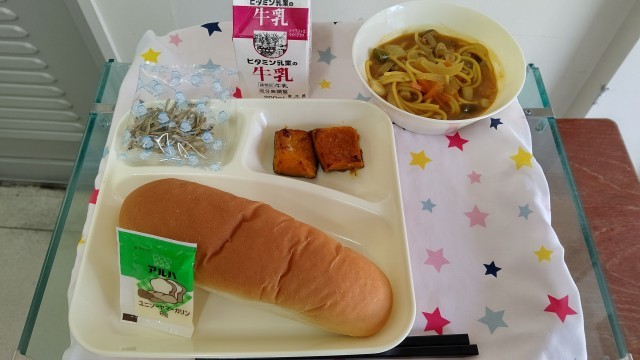 『カレースープスパゲッティ』は、鶏肉、ベーコンを主材に、玉ねぎ、にんじん、ピーマンを使用したカレー味のスープスパゲッティです。『かぼちゃのマリネ焼き』は、野菜ブイヨン、ノンエッグドレッシングで下味をつけ焼いています。かぼちゃの自然な甘みとドレッシングのさっぱりとした酸味が絶妙な一品です。卵アレルギーのある児童も食べる事ができます。パンといっしょに美味しく頂きました。