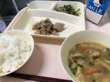 12月21日月曜日の献立 豚肉と干しずいきのみそ煮 すまし汁 焼きかぼちゃの甘...