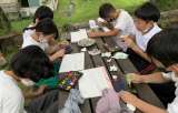 焼き板工作をしています。タオルで一生懸命擦って作っています。