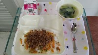 今日の献立カツカレーライス フルーツゼリー 牛乳今日は、入学祝い献立がでました。...