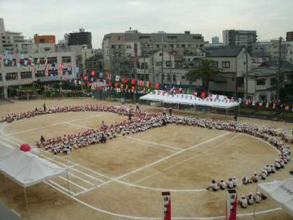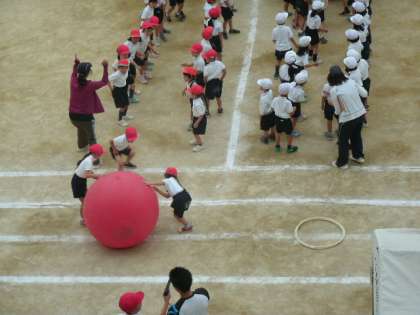 朝の時間に、全校競技「大玉送り」の練習をしました。