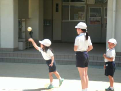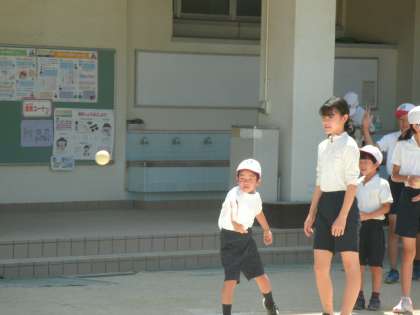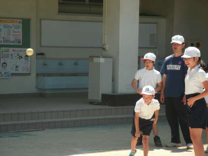 1年生が、6年生に協力してもらって、ソフトボール投げをしました。