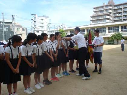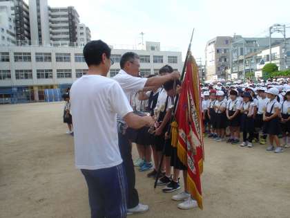 全校朝会では、深紅の優勝旗やカップとともに、一人ひとりにメダルが授与されました。