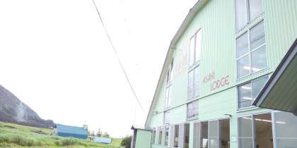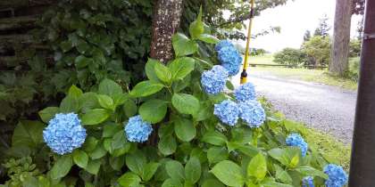 アジサイが色鮮やかです。体操した体育館です。焼き板の絵付けをします。おにぎりの朝食後に焼き板の絵付けをします。その後、登山を予定しています。