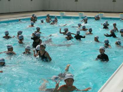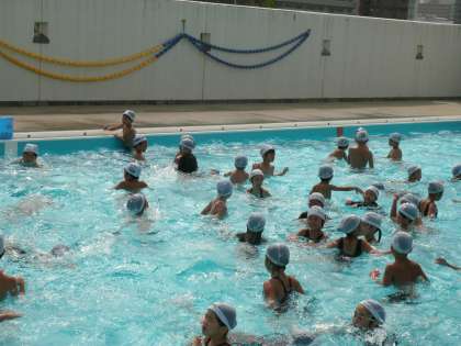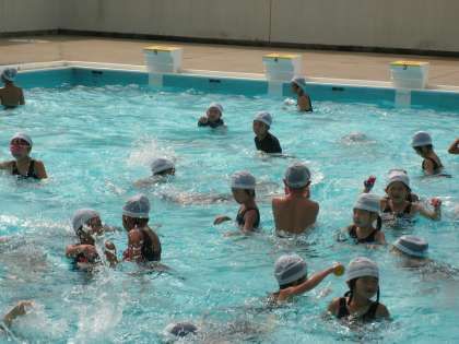 学校のプールで暑さを吹き飛ばしましょう。明日からは、特別練習も始まります。
