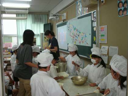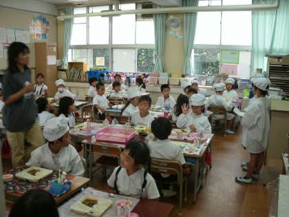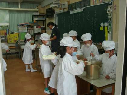 1年生の給食時間の様子です。みんなで準備しています。