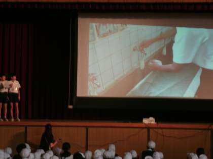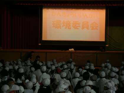 金曜日の朝は、児童集会の時間です。今日は、環境委員会の児童が、掃除の仕方について説明しました。みんなできれいな学校にしてください。