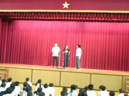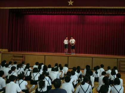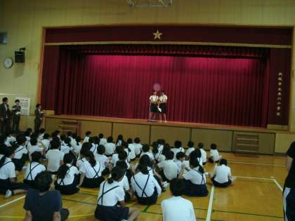 福島区役所の企画で、漫才トリオ『鱒之介(ますのすけ)』さんに来校していただき、5年生が漫才ワークショップを行いました。子ども達全員がコンビを組み、みんなの前で発表しました。担任の先生もトリオになり、漫才にチャレンジしました。人前で発表し、楽しい時間を作り出すことを体験し、素敵な時間を過ごすことが出来ました。最後は、鱒之介さんに、ほんまもんの漫才を披露していただきました。ありがとうございました。笑う門には福島区。