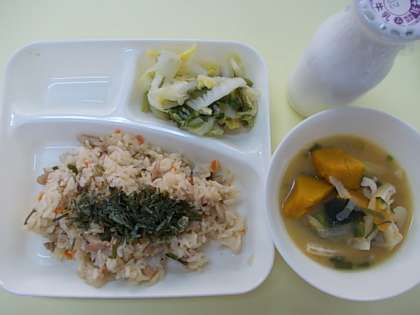 ≪今日の献立:かやくご飯、みそ汁、はくさいのゆず風味、牛乳≫