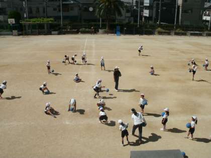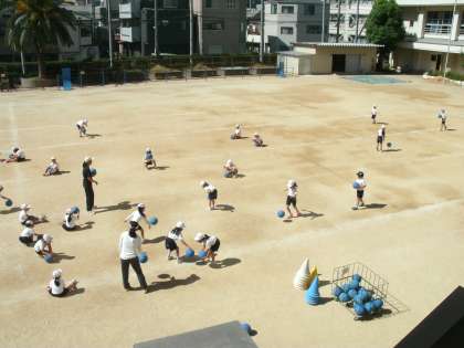 今日の朝の時間には『おはようタイム』、20分休みには、低学年の『ダッシュタイム』がありました。1年生は、引き続き体育の学習を行いました。みんなとっても元気です。1年1組の体育の学習の様子です。