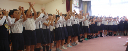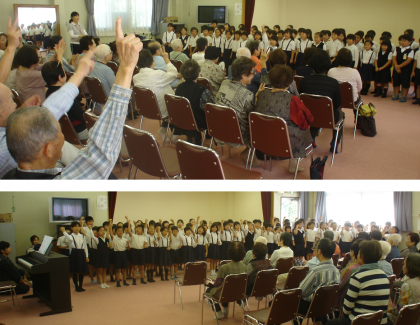 地域の参加者の前でごあいさつの後、英語の替え歌やクイズ、手話を交えた『パプリカ♪』の合唱など、きれいな歌声を響かせながら発表していました。