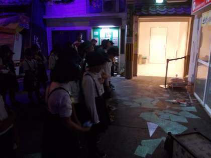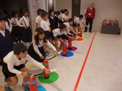 消火コーナーで、消火体験をしたり、消火器の使い方を学習したりしました。煙コーナーでは煙体験をしました。バーチャル地震コーナーでは、プロジェクションマッピングを体験しました。
