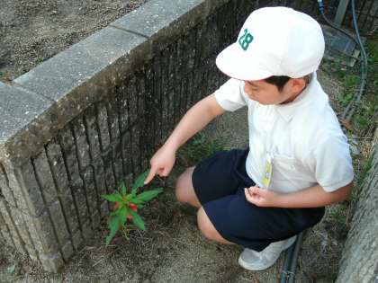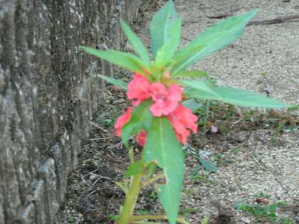 運動場の片隅では、ホウセンカが花を咲かせています。