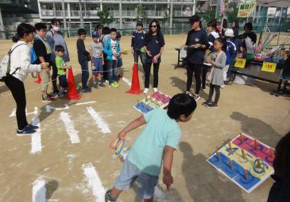 10時すぎより「開会宣言」のあと、子ども達は一斉に各校の出店に走り、輪なげやクジびきなどを楽しんでいました。