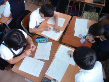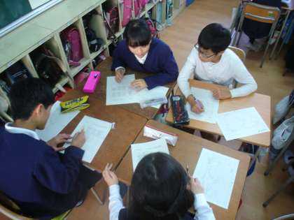 最初に、子ども達が知っているだけの国名をワークシートに記入し、その後グループごとに確認しあい、出し合った国名が多い順にランク付けしました。