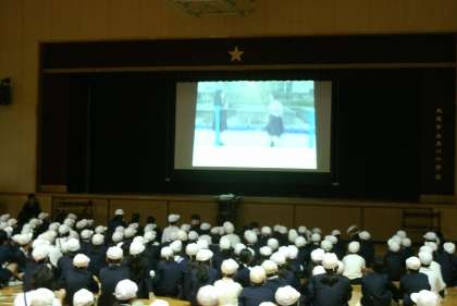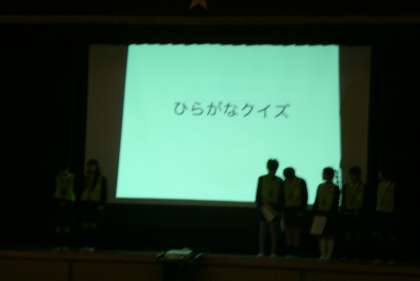 今日の児童集会は、『ひらがなクイズ』でした。5つの場面のひらがなをつなぐと「まきばしら」になりました。
