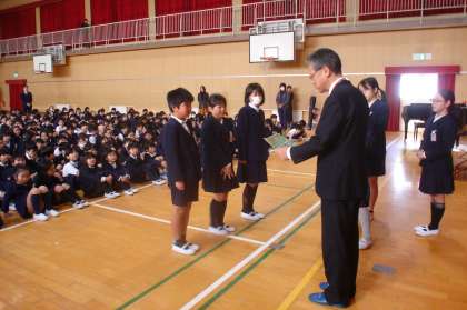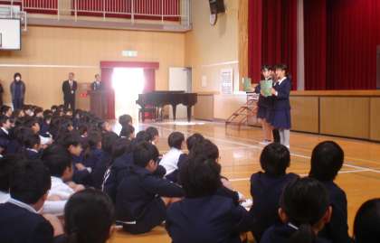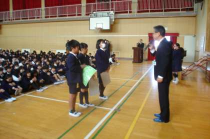 学級ごとに、エプロンの着用率やあいさつ、身だしなみなどを項目ごとにチェックし、優秀な学級を校長先生から表彰していただきます。