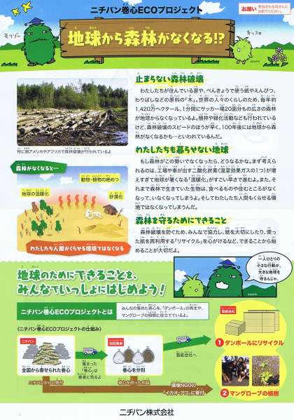 セロハンテープや両面テープやクラフトテープの巻き芯を集めてリサイクルします。集められた巻き芯は古紙回収業者に売却され段ボールにリサイクルされます。売られた利益は環境NGOに寄付されフィリピンのマングローブの植樹に役立てられます。巻き芯はニチバン製でなくても大丈夫です。お家でできた巻き芯もありましたら職員室にお持ちください。今ならキャンペーンシールがもらえます。