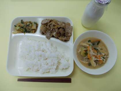 (今日の献立:豚肉のしょうが焼き、さつまいものみそ汁、きくなとはくさいのごまあえ、ごはん、牛乳)