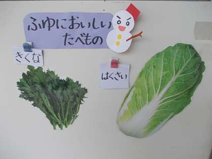今日の献立には、今が旬の「きくな」と「はくさい」のごまあえが登場しました。冬野菜は、寒さに耐えてみずみずしさを失いません。それぞれが冷気から身を守る術を身につけています。風邪などが流行る今の時期は、食生活から体を守るとよいですね。