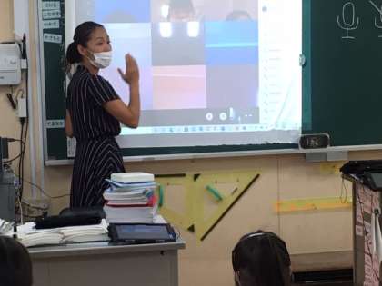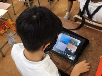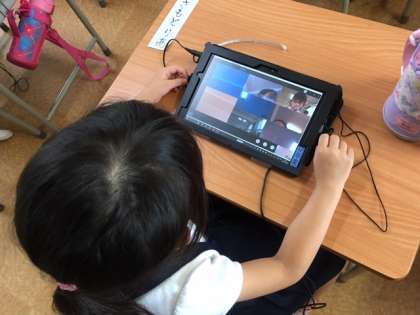 なかなかWi-Fi環境が厳しい中、1年生がタブレットをつかって、双方向通信に挑戦しました。ソフトは、Teamsという名前のものです。