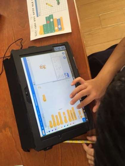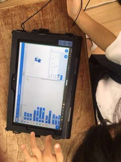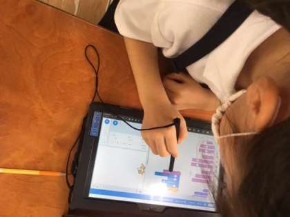 今年本校で取り組んでいるプログラミング学習の一環で、タブレットを1年生が使いました。使ったアプリは、スクラッチです。
