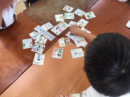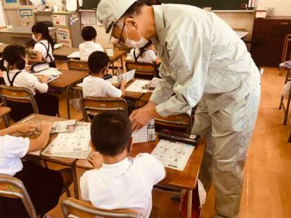 各学年に分かれての防災体験では、1年生は防災意識を高めるための『防災かるた』、2年生は地震後の屋内移動を少しでもスムーズにするための『紙スリッパづくり』、3年生は疑似燻煙した多目的室を移動しながら、身を守るための『煙避難訓練』がありました。